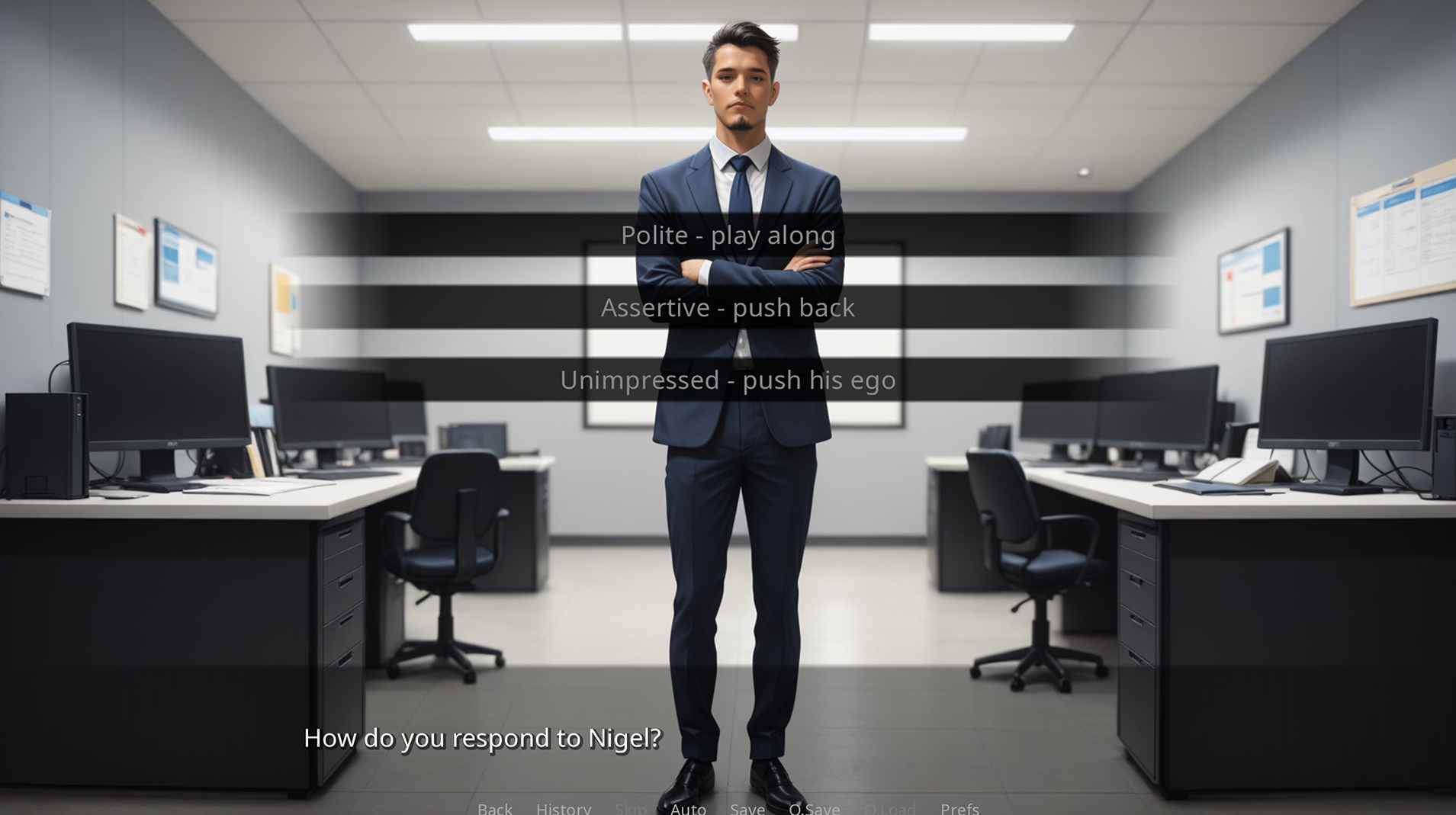 Among your colleagues are Blair, the razor-tongued teamlead who respects backbone more than charm; Anaru, the bright psychology student who paints people better than she understands herself; Hana, the calm and quietly insightful junior stylist; Indica, a grounded free spirit who teaches yoga and perspective; Vanessa; former model and the owner, suspiciously hard to read; and Nigel, a buzzword-spewing manager convinced synergy is a lifestyle.